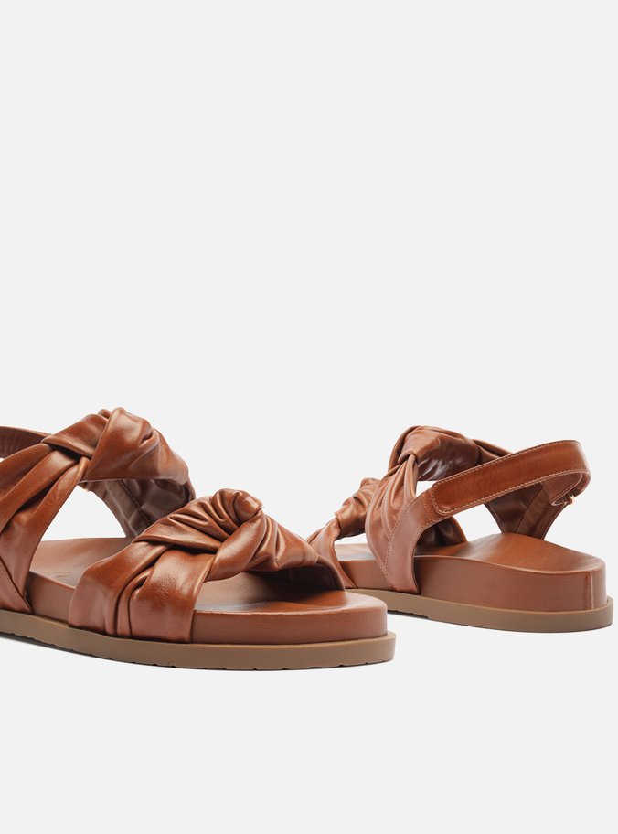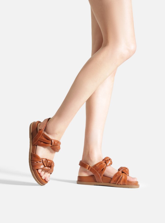 Descrição: Sandália rasteira feminina marrom de couro. O sapato tem palmilha com formato anatômico, solado flatform e base emborrachada, além de formato arredondado na ponta. Traz tiras largas sobre os dedos e a parte superior do pé, com efeito franzido e nó grande central. Possui tira no calcanhar com fechamento em velcro ajustável.