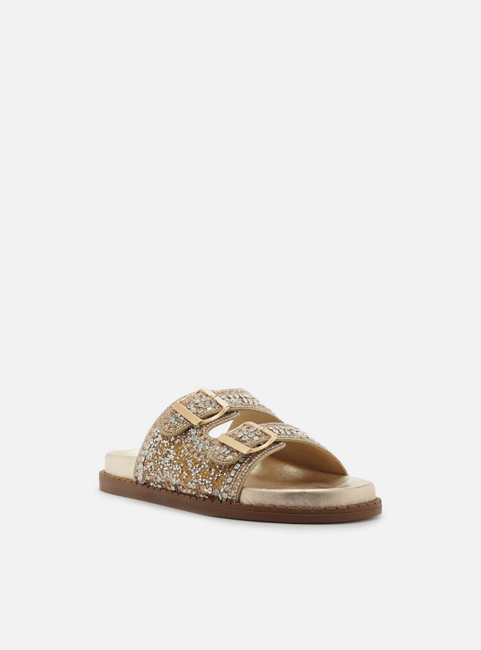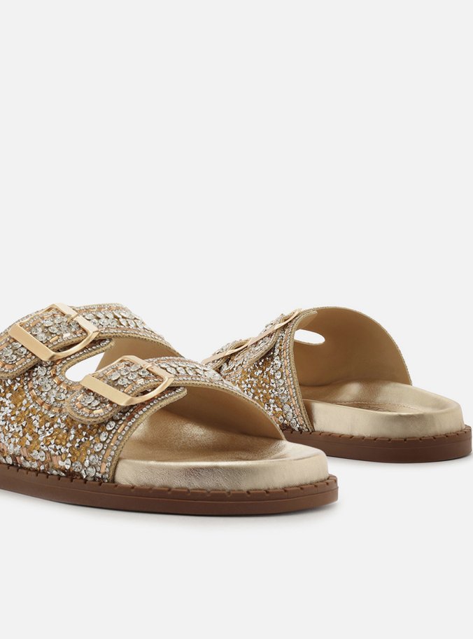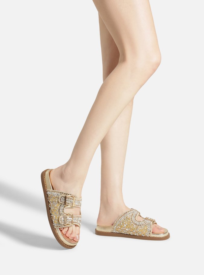 Descrição: Sandália papete dourada. O sapato tem salto rasteiro, palmilha com formato anatômico e inscrição do nome da marca. Possui solado flatform, base emborrachada e formato arredondado na ponta. Traz cabedal semi coberto com aplicações de miçangas douradas e pratas, além de duas tiras largas sobre os dedos e na parte superior do pé com fivelas metálicas laterais.