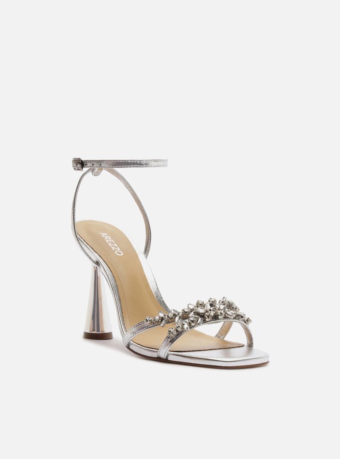 Sandália Prata Couro Salto Alto Taça Pedrarias
