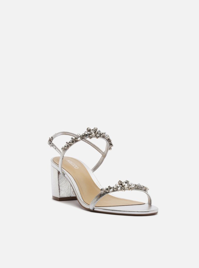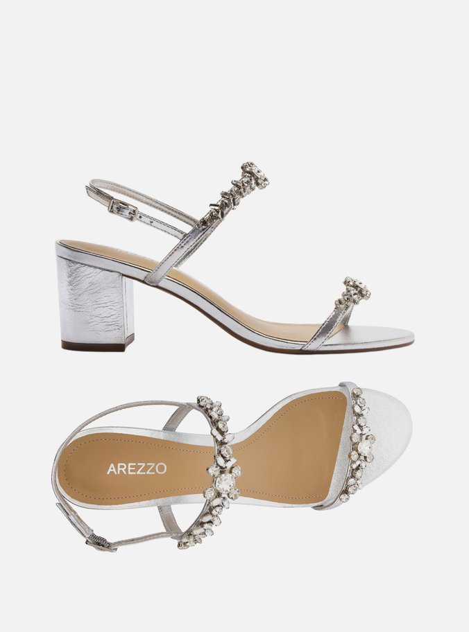 Descrição: Sandália feminina prata de couro. O sapato tem salto médio bloco e formato arredondado na ponta. Traz tiras finas sobre os dedos e na parte superior do pé, ambas com aplicação de pedrarias. Possui tira afivelada no calcanhar. Com palmilha bege e inscrição do nome da marca.