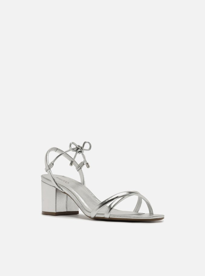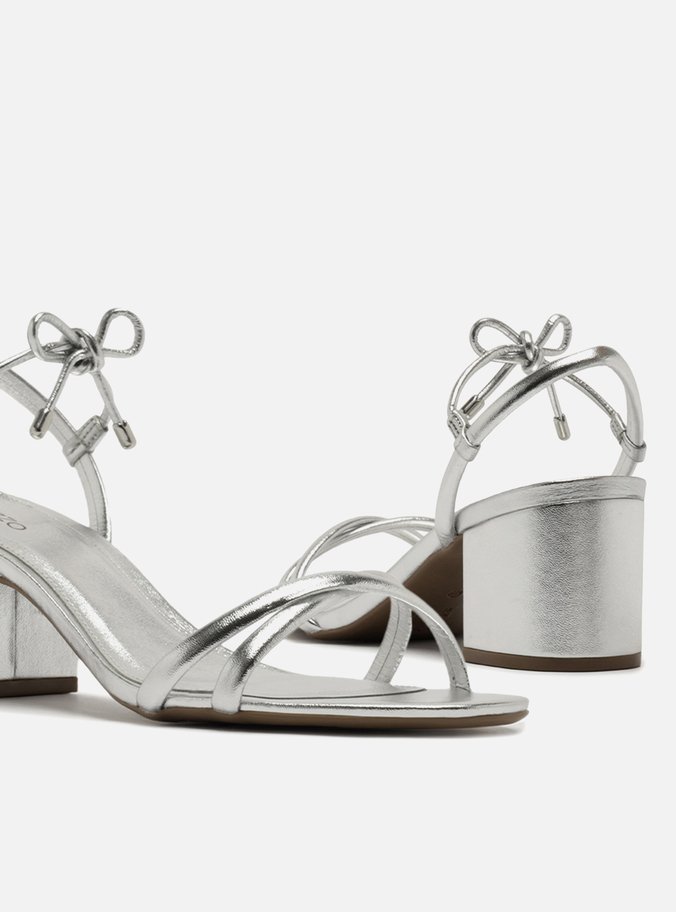 Descrição: Sandália feminina prata. O sapato tem salto médio bloco e formato arredondado na ponta. Possui tiras finas cruzadas sobre os dedos e tira no calcanhar conectada a amarração no tornozelo, que fecha em laço. Com palmilha da cor do calçado e inscrição do nome da marca.