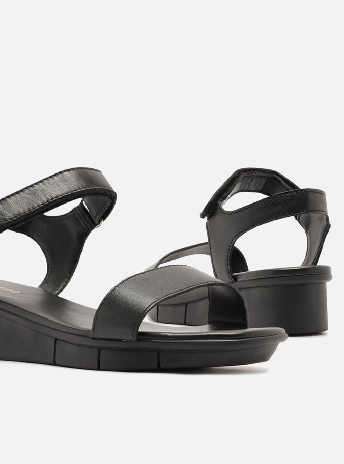 Descrição: Sandália preta de couro. O modelo tem salto baixo flatform e bico redondo. Traz tira sobre os dedos. Aberta, possui tiras em torno do calcanhar e laterais com fechamento em velcro no tornozelo. Com palmilha extra macia e gravação do nome da marca. A sandália exibe todo o pé.