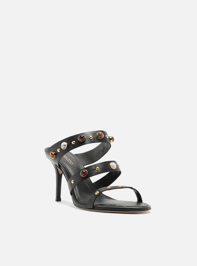 Sandália Preta Couro Salto Fino Tiras Pedras