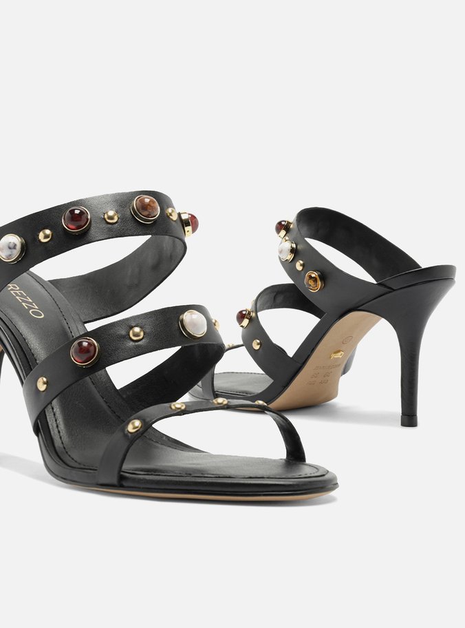 Descrição: Sandália feminina preta de couro. O sapato tem salto médio fino e formato arredondado na ponta. Traz tira fina sobre os dedos com aplicação de rebites e mais duas tiras médias na parte central e superior do pé, com rebites e pedrarias coloridas. Com palmilha lisa da cor da sandália e inscrição do nome da marca. A sandália exibe todo o pé.