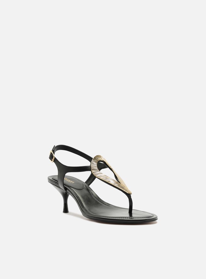 Descrição: Sandália feminina de couro preta. O sapato tem salto baixo fino e formato arredondado na ponta. Traz tiras finas dividindo os dedos, com aplicação de metal dourado, grande, vazado e com textura riscada no centro. Possui tira na parte superior do pé e tira no calcanhar com fecho em fivela metálica. Com palmilha da cor do calçado, contorno em pesponto e inscrição do nome da marca. A sandália exibe todo o pé.