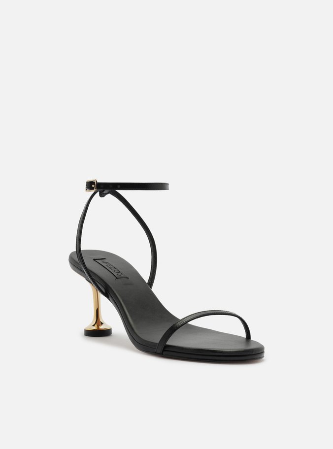 Sandália Preta Couro Salto Médio Taça Dourado