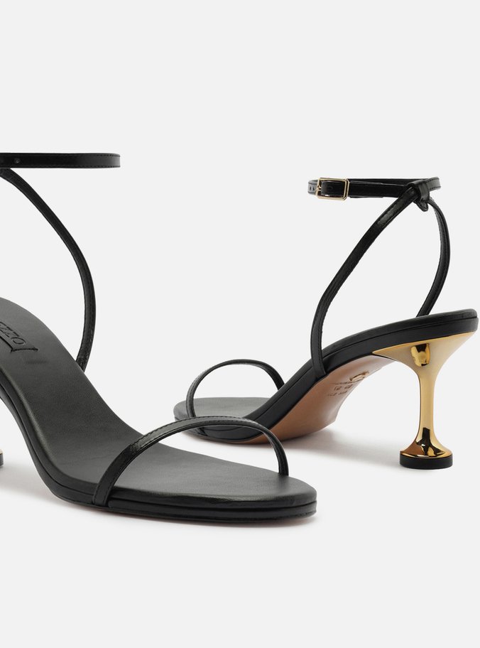 Descrição: Sandália feminina preta de couro. O sapato tem salto médio taça metálico dourado e formato arredondado na ponta. Possui tira fina sobre os dedos, além de tiras finas que saem das laterais, cruzam no calcanhar, contornam o tornozelo e fecham em fivela lateral ajustável. Com palmilha preta e inscrição do nome da marca.
