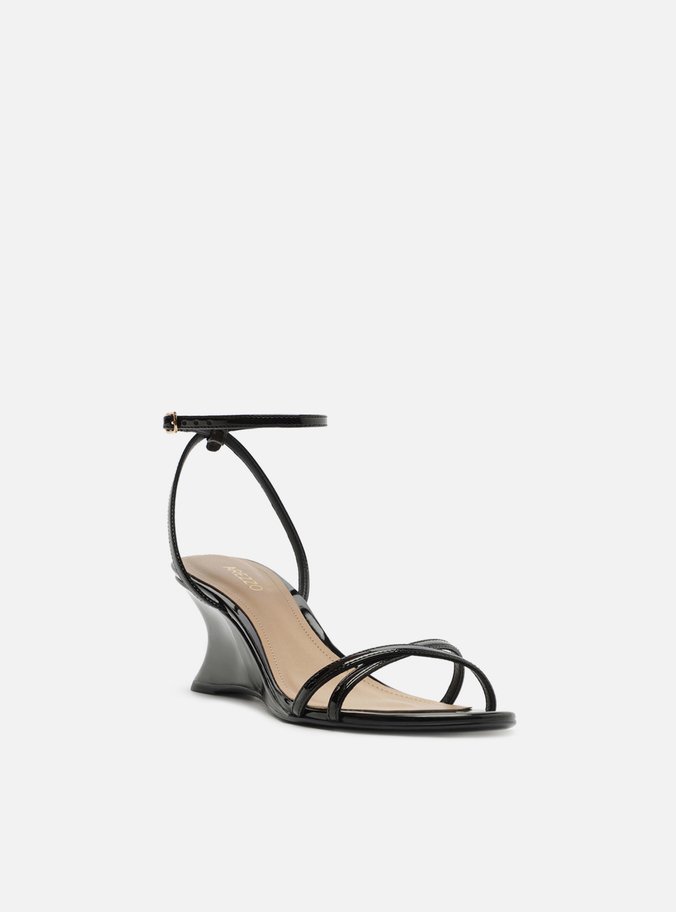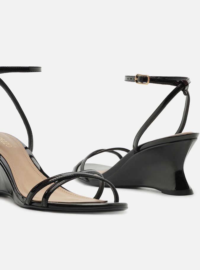 Descrição: Sandália feminina preta com acabamento envernizado. O sapato tem salto médio anabela curvo e formato arredondado na ponta. Traz tiras finas cruzadas sobre os dedos. Possui tira fina que sai das laterais, contorna o tornozelo e fecha em fivela lateral. Com palmilha bege e inscrição do nome da marca. A sandália exibe todo o pé.