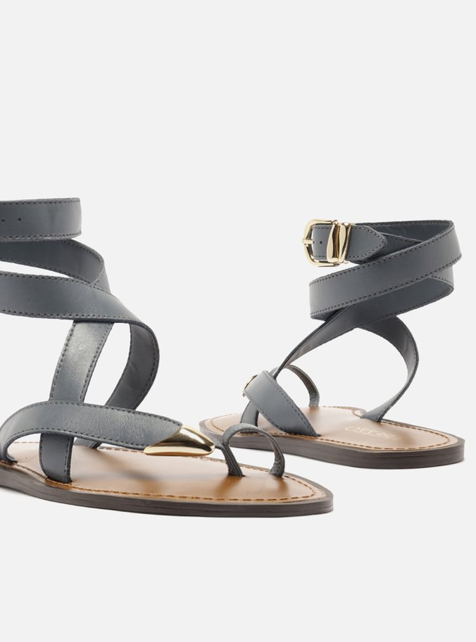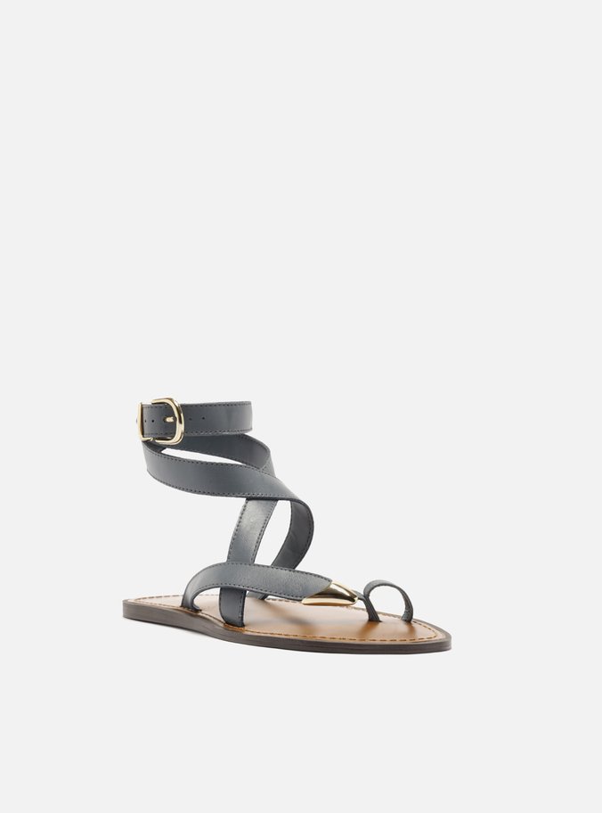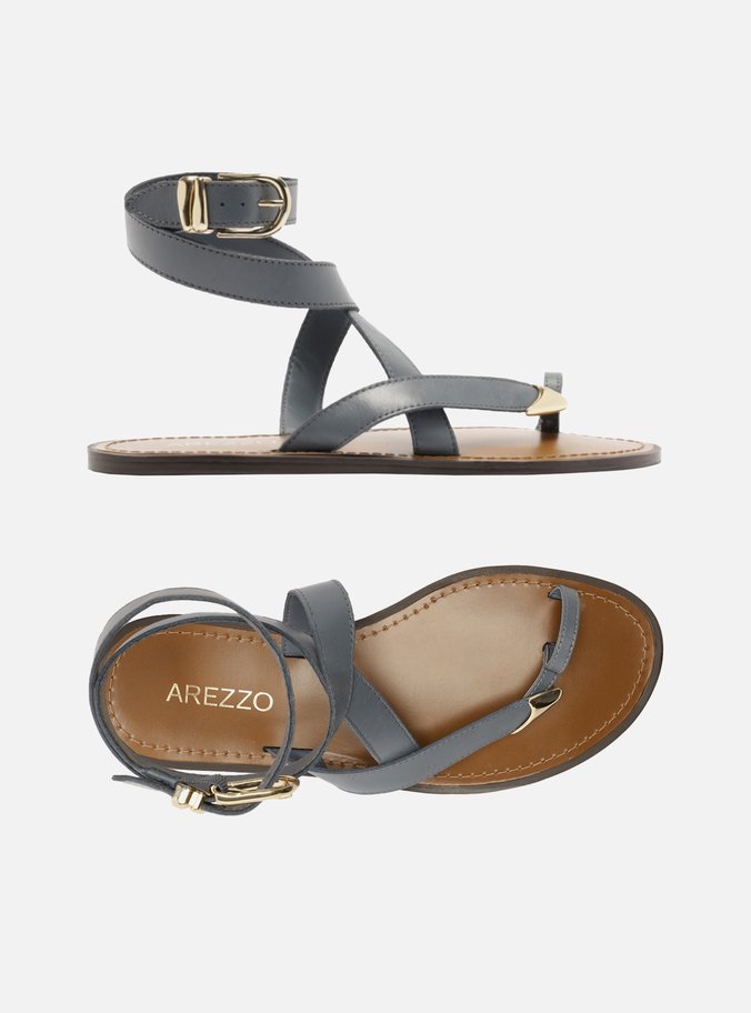 Descrição: Sandália rasteira feminina azul de couro. O sapato tem sola rasteira flat e formato arredondado na ponta. Traz tiras que dividem os dedos, sendo uma delas com ponteira metálica robusta. Possui ainda tiras que envolvem o tornozelo, com fechamento por fivela metálica dourada lateral. Com palmilha marrom, contorno em pesponto e inscrição do nome da marca.