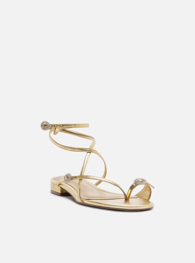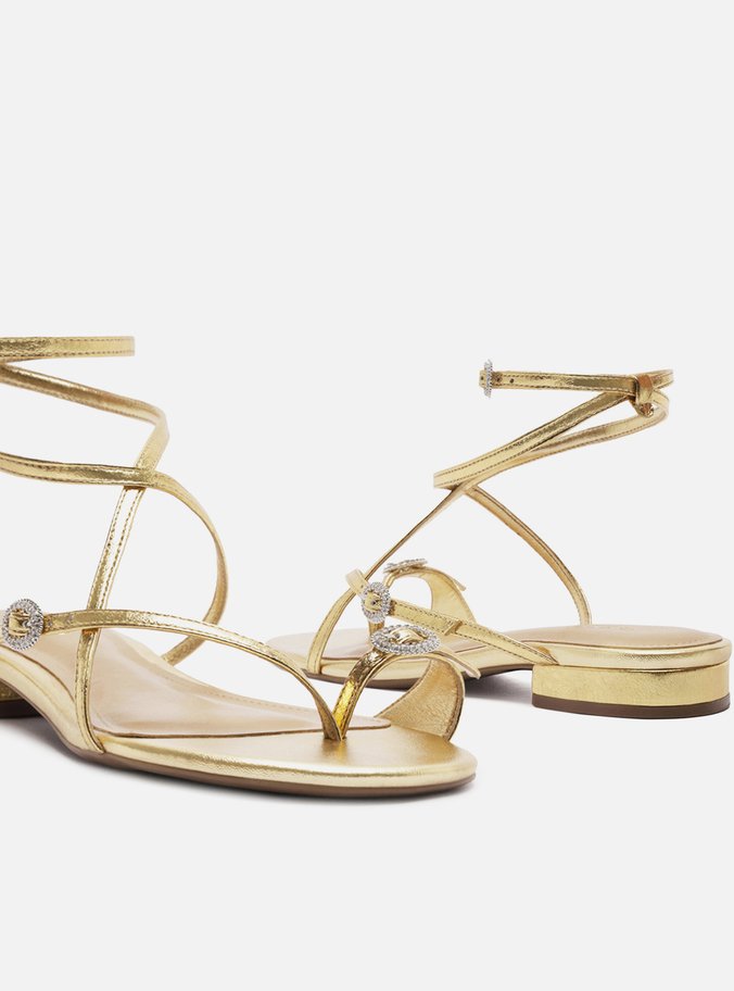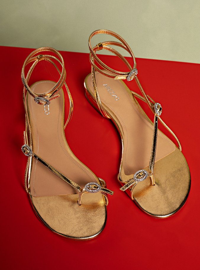 Sandália Rasteira Dourada Couro Fivelas Cristais