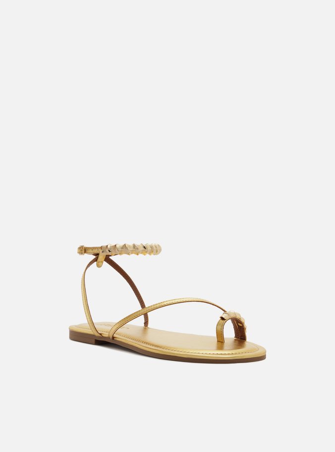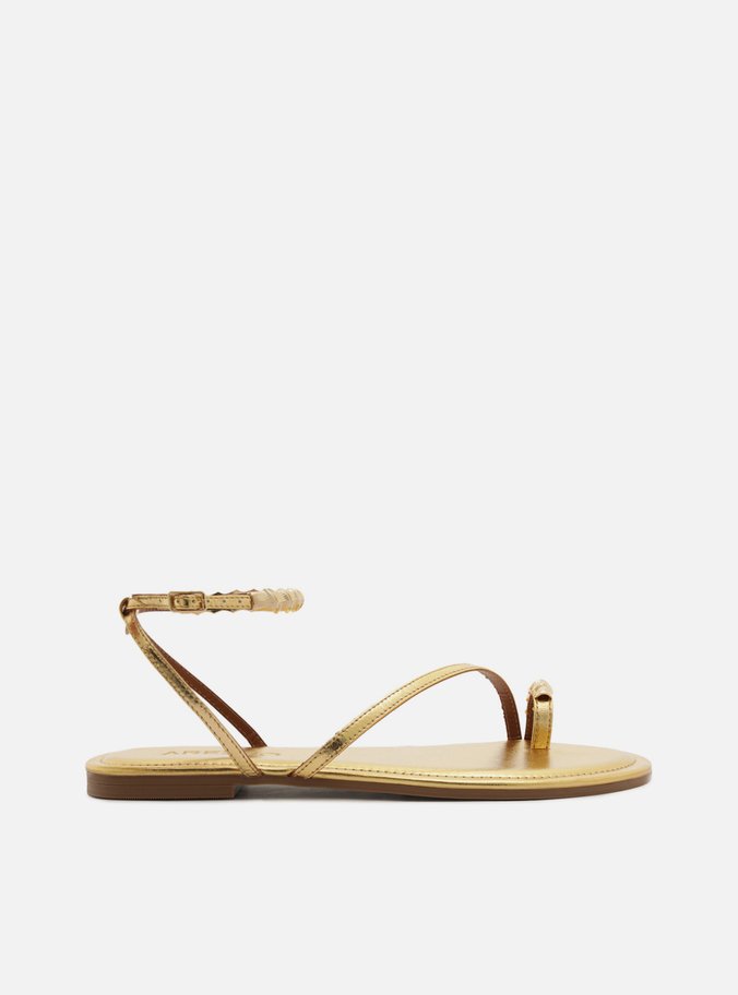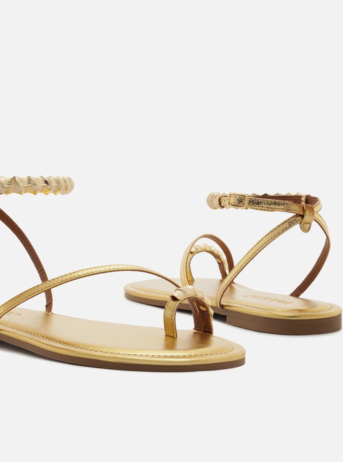 Descrição: Sandália feminina dourada de couro. O sapato tem salto rasteiro e formato arredondado na ponta. Possui tira fina que cruza a parte superior do pé em diagonal, além de tira dedeira com aplicação de metais dourados. Traz tiras finas que saem das laterais, cruzam no calcanhar, contornam o tornozelo e fecham em fivela lateral, também com aplicação de metais dourados. Com palmilha estofada da cor da sandália e tag do nome da marca.