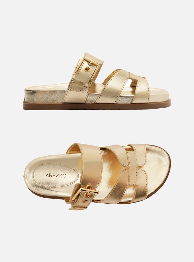 Descrição: Sandália feminina dourada de couro. O sapato tem salto rasteiro, palmilha em couro com formato anatômico e gravação do nome da marca. Possui solado flatform, base emborrachada e formato arredondado na ponta. Traz cabedal com tiras vazadas, além de costuras pesponto por todo o contorno. Possui tiras na parte superior do pé com fecho em fivela metálica lateral grande. Deixa parte do pé à mostra.