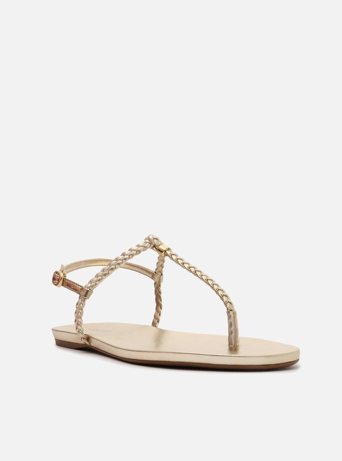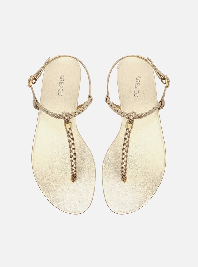 Descrição: Sandália rasteira dourada. O modelo slim tem sola flat e bico redondo. Traz tira fina trançada, que passa entre os dedos e com detalhe metálico, conectada a mais uma tira fina trançada no peito do pé. Possui ainda tira fina lisa em torno do calcanhar com fecho em fivela metálica lateral. Com palmilha da cor do modelo e inscrição do nome da marca. Aberta, a sandália exibe todo o pé