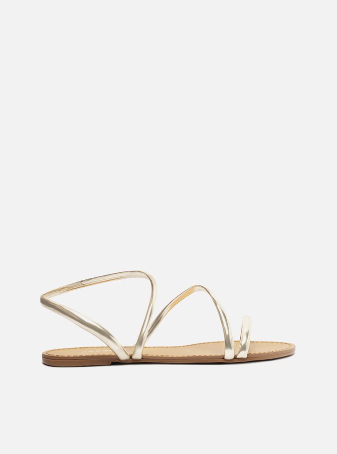 Descrição: Sandália dourada com acabamento em alto brilho. O modelo tem salto rasteiro e bico redondo. Traz uma tira bombada sobre os dedos e outra no peito do pé, na diagonal. Possui ainda tira bombada que sai da lateral e contorna o calcanhar. A sandália é aberta e exibe todo o pé. Com palmilha marrom e inscrição do nome da marca.
