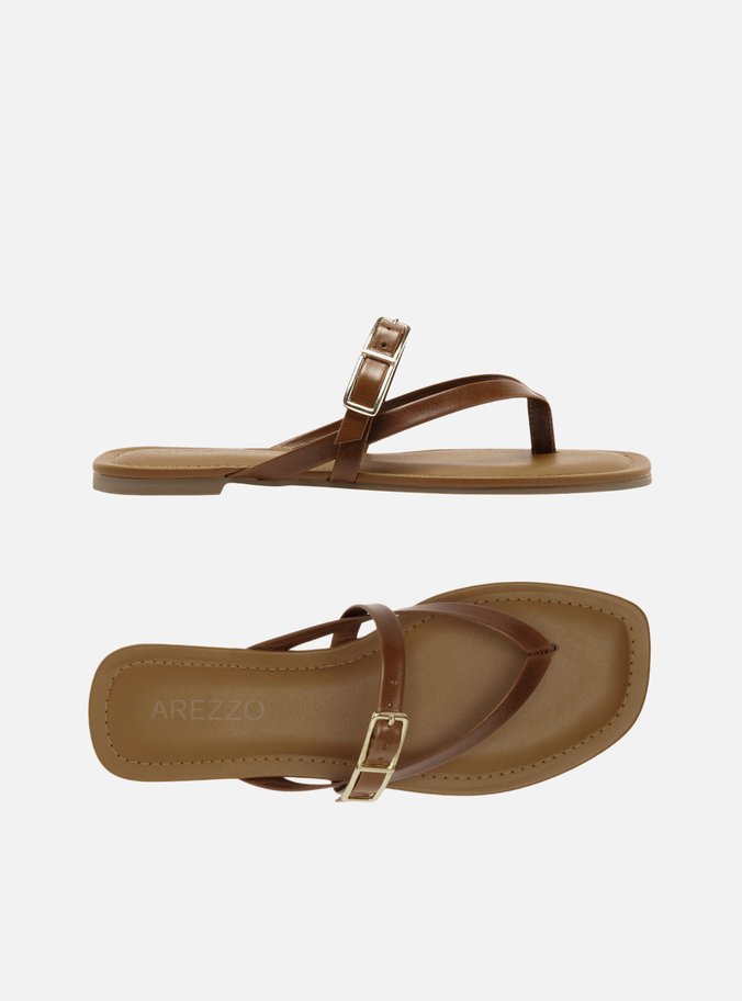 Descrição: Sandália rasteira feminina marrom de couro. O sapato tem sola flat e formato quadrado na ponta. Possui duas tiras finas que dividem os dedos, além de tira fina na parte superior do pé, na horizontal, com fivela metálica dourada dupla. Com palmilha estofada na cor da rasteira e inscrição do nome da marca.