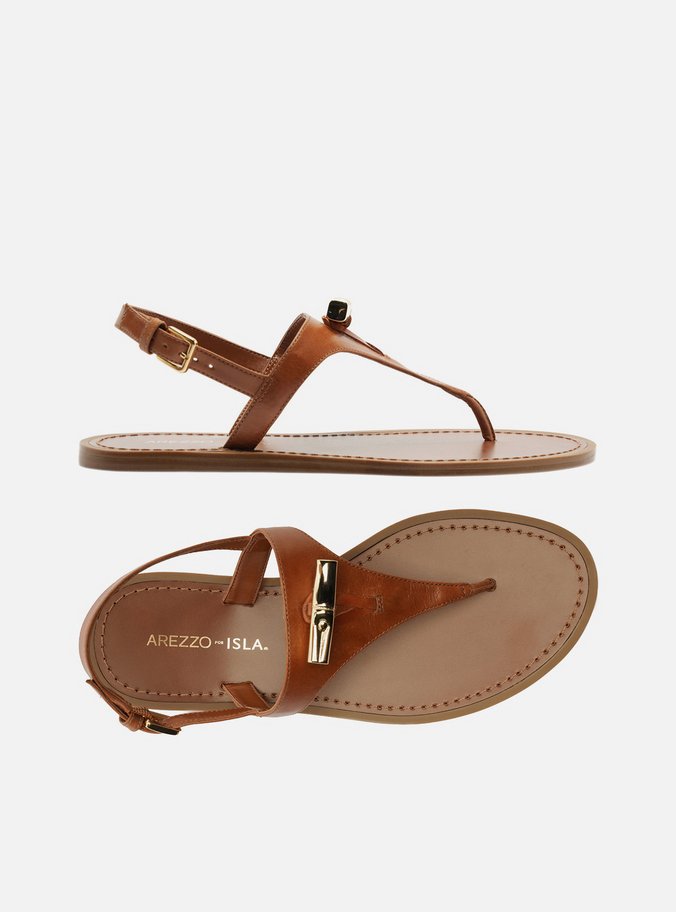 Descrição: Sandália rasteira feminina marrom em couro. O sapato tem sola flat e formato arredondado na ponta. Traz tira larga dividindo os dedos, em formato triangular, que cobre parcialmente a parte superior do pé, com aplicação de metal dourado. Possui ainda tira fina em torno do calcanhar com fecho em fivela metálica lateral. Com palmilha lisa, contorno em pesponto e inscrição do nome da marca.