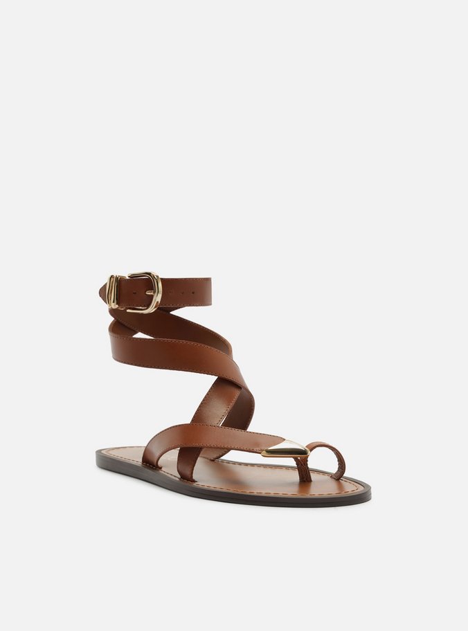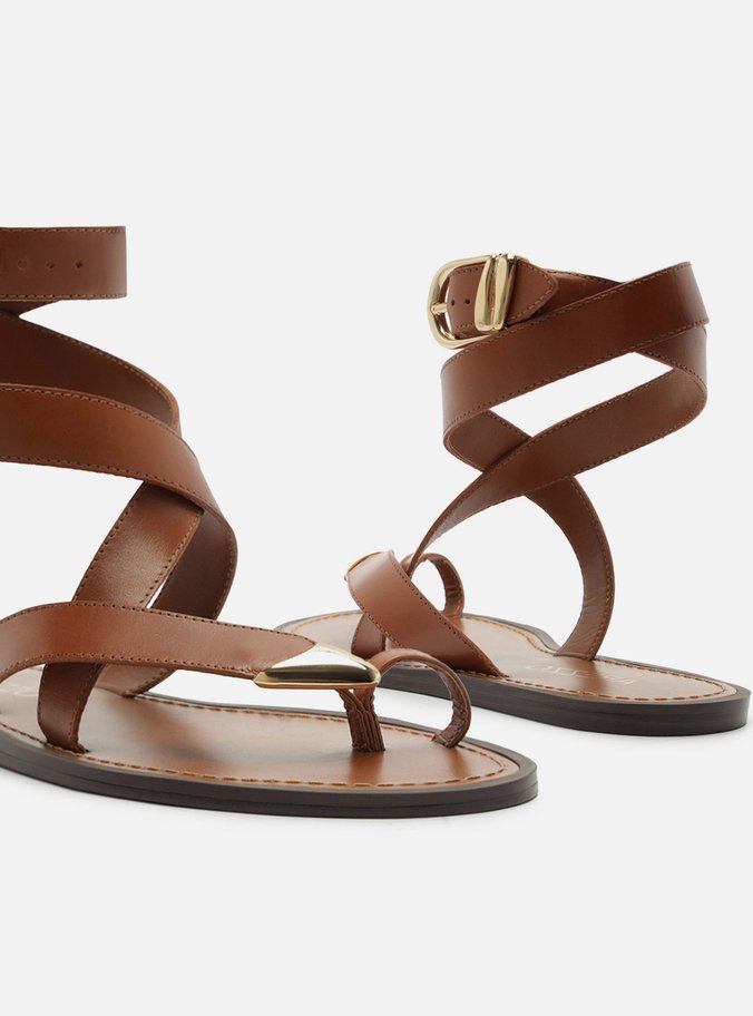 Descrição: Sandália rasteira feminina marrom de couro. O sapato tem sola rasteira flat e formato arredondado na ponta. Traz tiras que dividem os dedos, sendo uma delas com ponteira metálica robusta. Possui ainda tiras que envolvem o tornozelo, com fechamento por fivela metálica dourada lateral. Com palmilha marrom, contorno em pesponto e inscrição do nome da marca.