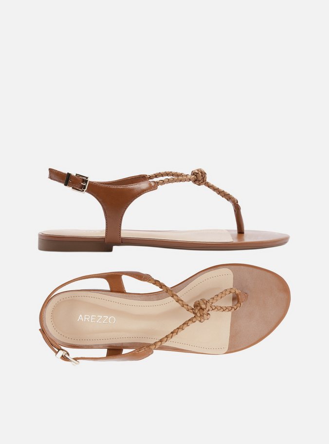 Descrição: Sandália feminina marrom. O sapato tem sola rasteira flat e formato arredondado na ponta. Possui tiras finas em efeito chicote que dividem os dedos e seguem pela parte superior do pé, unidas por nó central. As tiras se conectam às laterais e ao calcanhar, fechando em fivela metálica lateral. Com palmilha bege e inscrição do nome da marca. A sandália exibe todo o pé.