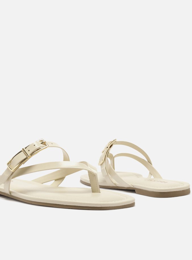 Descrição: Sandália rasteira feminina off white de couro. O sapato tem sola flat e formato quadrado na ponta. Possui duas tiras finas que dividem os dedos, além de tira fina na parte superior do pé, na horizontal, com fivela metálica dourada dupla. Com palmilha estofada na cor da rasteira e inscrição do nome da marca.