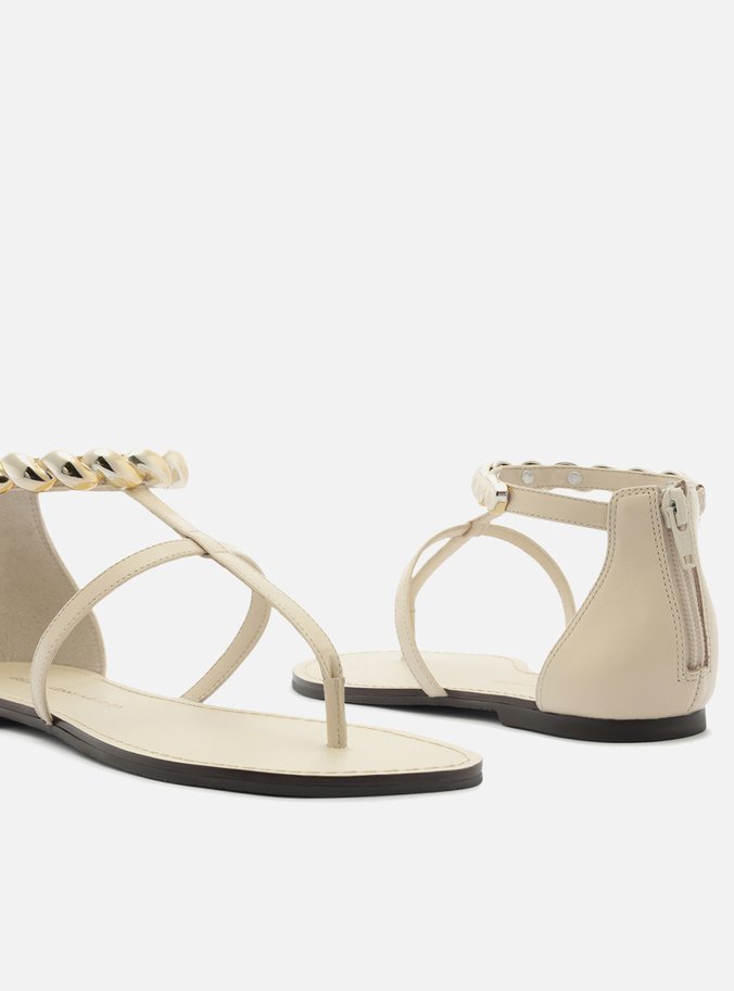 Descrição: Sandália rasteira feminina branca em couro. O sapato tem sola flat e formato arredondado na ponta. Traz tira fina que divide os dedos, conectada à tira no tornozelo, com aplicação de metal dourado em efeito torcido. Fechada no calcanhar, possui zíper traseiro. Com palmilha da cor da sandália e inscrição Arezzo / Lenny Niemeyer. A sandália exibe todo o pé.