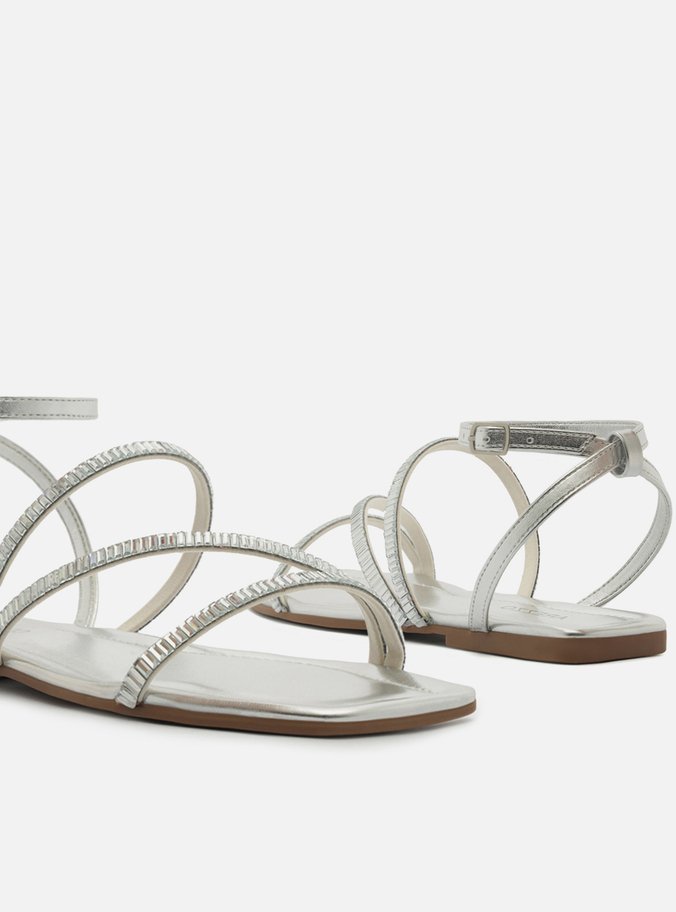 Sandália Rasteira Prata Tiras Aplicações