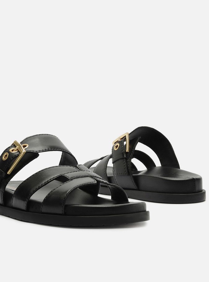 Descrição: Sandália preta de couro. O modelo tem salto rasteiro, palmilha com formato anatômico e gravação do nome da marca. Possui solado flatform, base emborrachada e bico redondo. Traz cabedal em tiras vazadas e formato H, além de costuras pesponto por todo o contorno. Possui tiras no peito do pé com fecho em fivela metálica lateral grande. Deixa parte do pé à mostra.