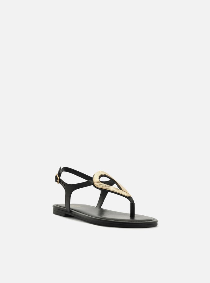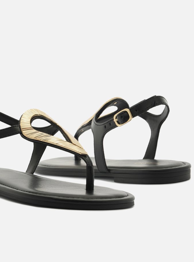Descrição: Sandália feminina de couro preta. O sapato tem salto rasteiro e formato arredondado na ponta. Traz tiras finas dividindo os dedos, com aplicação de metal dourado, grande, vazado e com textura riscada no centro. Possui tira na parte superior do pé e tira no calcanhar com fecho em fivela metálica. Com palmilha da cor do calçado, contorno em pesponto e inscrição do nome da marca. A sandália exibe todo o pé.
