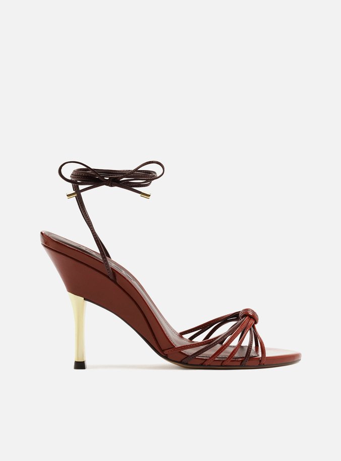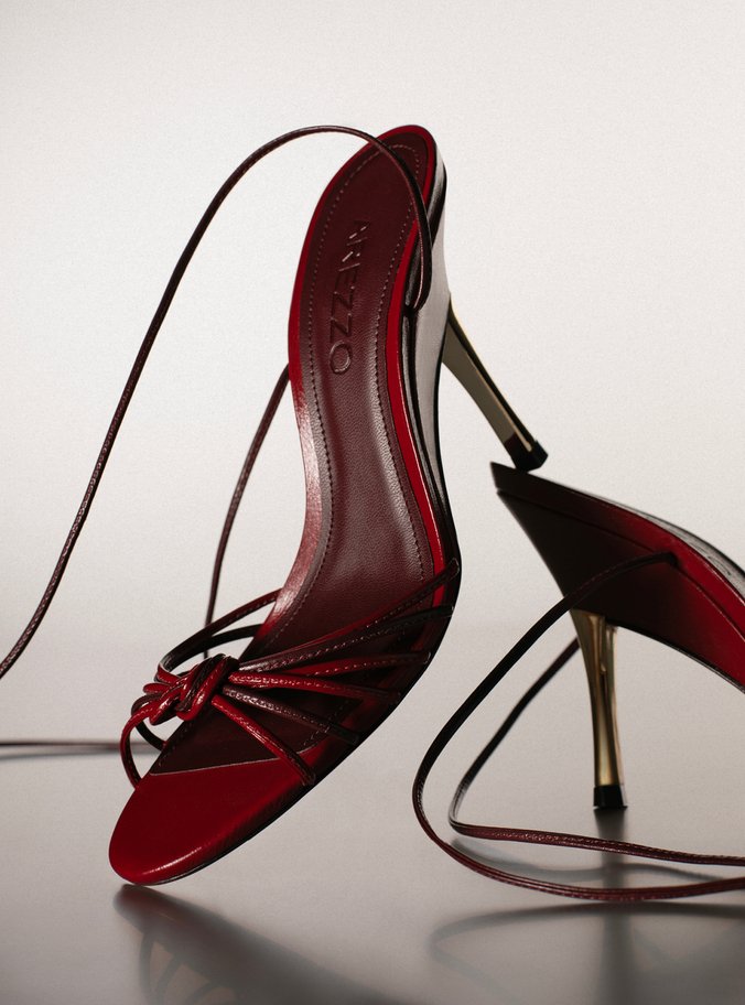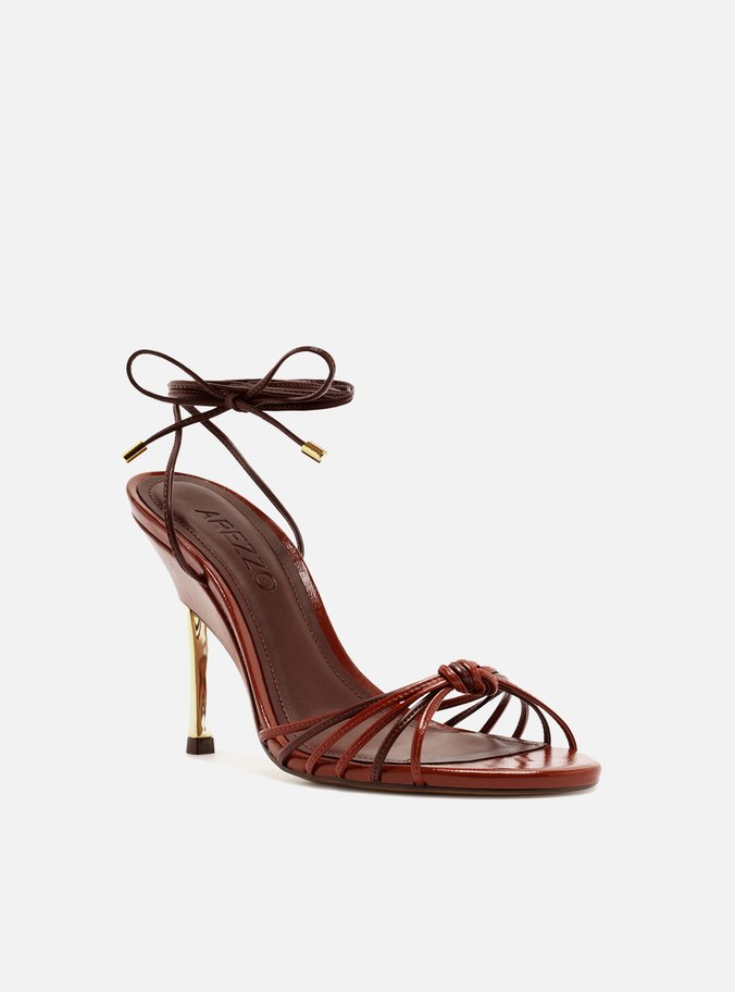 Descrição: Sandália feminina vermelha em couro com acabamento envernizado. O sapato tem salto alto fino metálico dourado, com base da sola mais larga, e formato arredondado na ponta. Possui tiras finas em tons de vermelho e bordô sobre os dedos, unidas por nó central, além de tiras finas que saem das laterais, contornam o tornozelo e fecham em amarração superior. Com palmilha lisa bordô e inscrição do nome da marca.