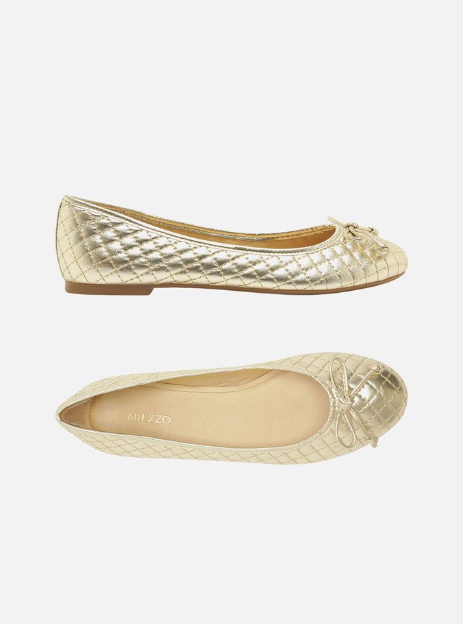 Descrição: Sapatilha dourada. O modelo tem salto rasteiro e bico redondo. Traz cabedal em matelassê e recorte arredondado sobre o peito do pé. Fechada, possui ainda aplicação de laço pequeno no cabedal. Com palmilha da cor do modelo e inscrição do nome da marca, a sapatilha exibe todo o peito do pé.