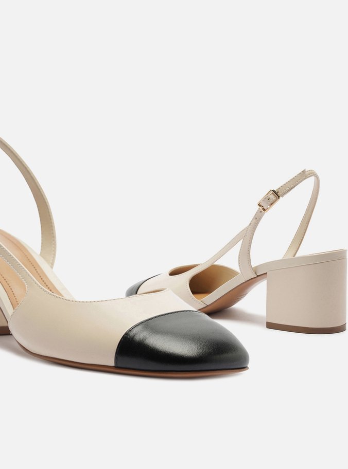 Scarpin Branco Couro Bloco Slingback Cap Toe Preto
