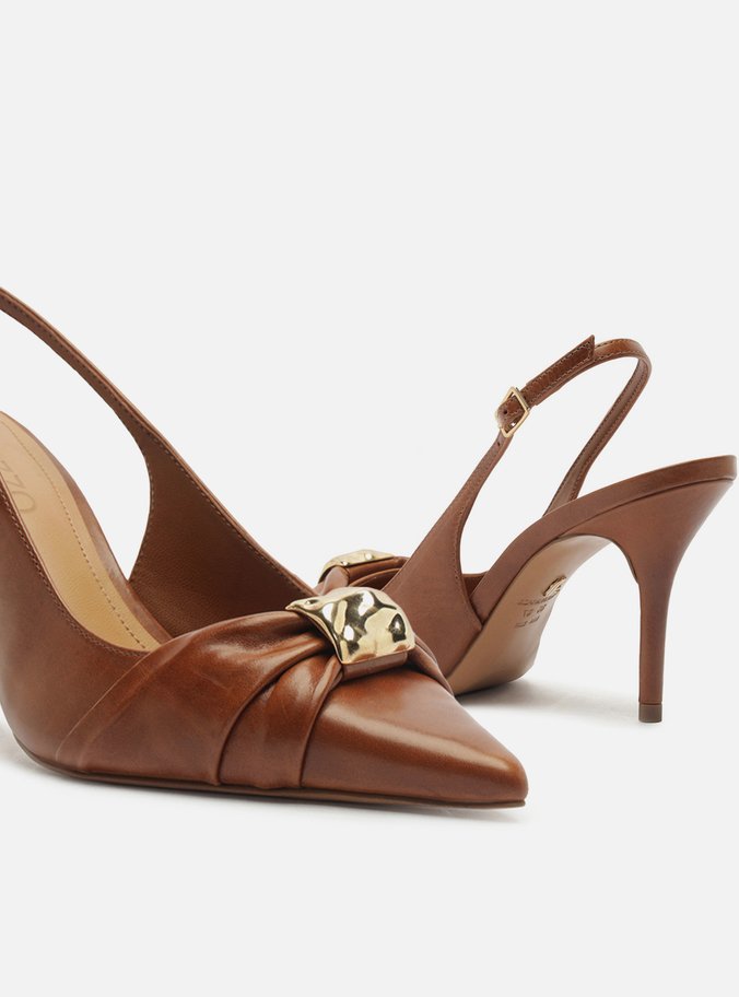 Scarpin Marrom Couro Bico Fino Slingback Metal