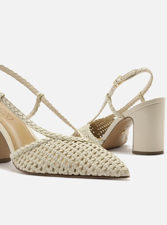 Scarpin Off White Trançado Salto Médio Bloco Slingback