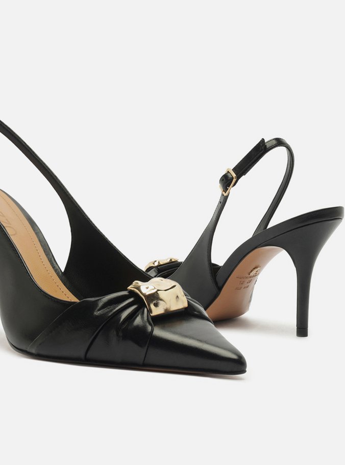 Scarpin Preto Couro Bico Fino Slingback Metal