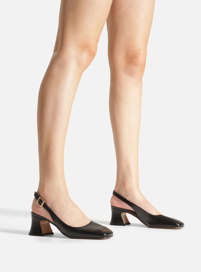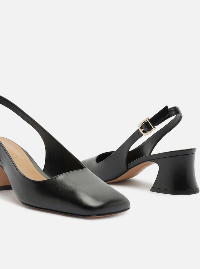 Scarpin Preto Couro Bloco Bico Quadrado Slingback