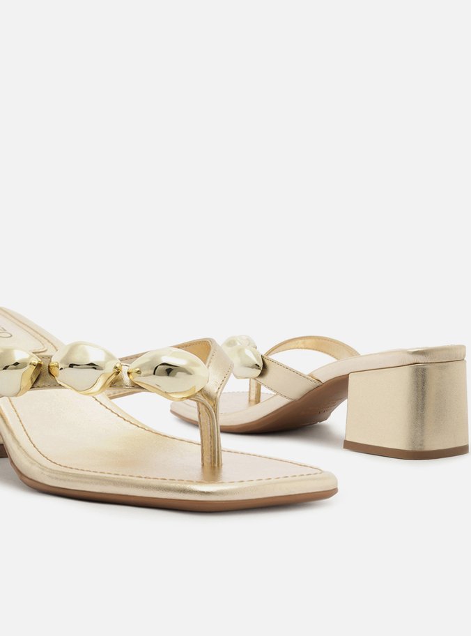 Tamanco Dourado Couro Salto Bloco Tiras Metais