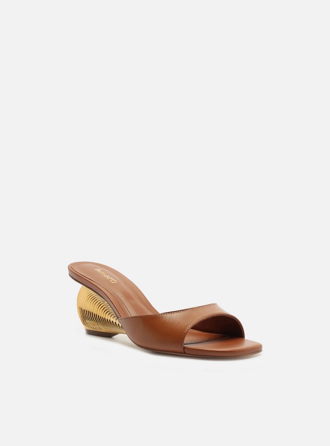 Descrição: Tamanco marrom. O sapato tem salto médio geométrico dourado, inteiro e com textura de curvas, e formato quadrado na ponta. Traz tira larga e única sobre os dedos. Aberto, com palmilha da cor do modelo e gravação do nome da marca.