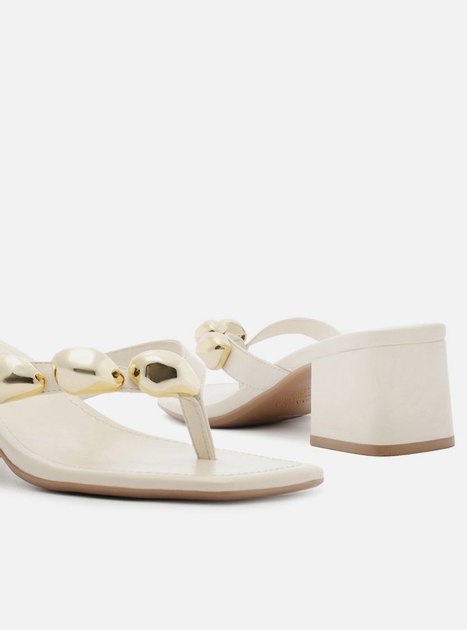 Descrição: Tamanco branco de couro. O sapato tem salto médio bloco e formato quadrado na ponta. Traz tiras dividindo os dedos e com aplicação de metais dourados, espessos e orgânicos em uma delas. Com palmilha da cor da sandália e nome da marca. A sandália exibe todo o pé.