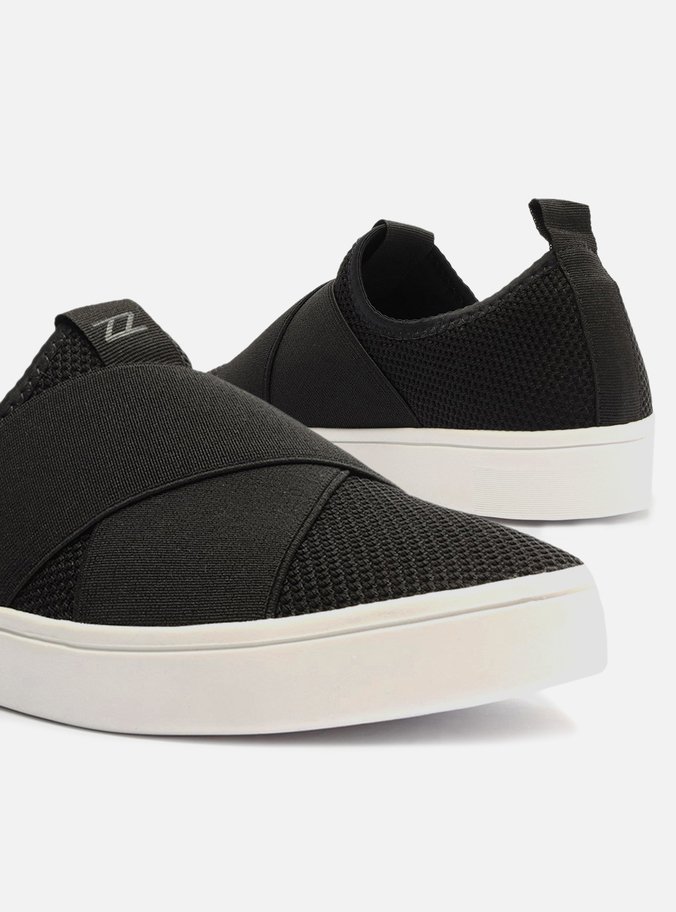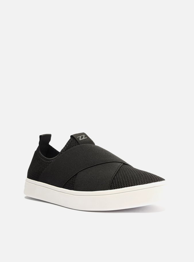Descrição: Tênis slip on preto. O modelo tem solado baixo emborrachado branco com contorno em costura pesponto. Traz cabedal em tecido texturizado e cano estilo meia. De bico redondo, o tênis tem dois elásticos largos cruzados sobre o peito do pé e tag de gorgurão ZZ na lingueta