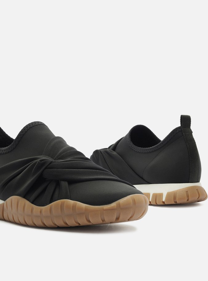 Descrição: Tênis feminino preto em fibra têxtil elástica. O sapato tem sola baixa, esportiva, emborrachada e bege, com relevo riscado e irregular e formato arredondado na ponta. Sem fechamento, traz cabedal com sobreposição torcida na parte superior do pé e tira de gorgurão na parte traseira do cano, que facilita o calce.